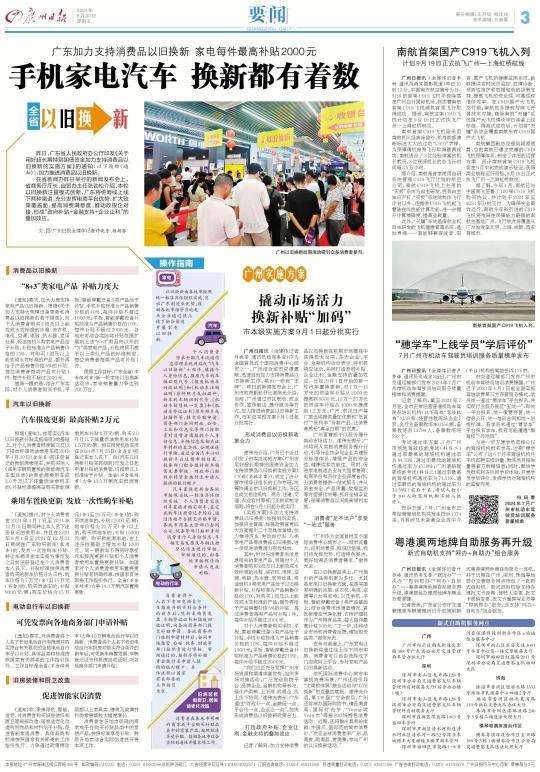 作为全国首批五个国际消费中心城市之一,广州结合城市资源禀赋,迅速启动加力支持消费品以旧换新工作,亮出一张张“王牌”。昨日的新闻发布会上,广州市政府副秘书长谢伟光介绍,当前,广州通过市区联动、政企协作、宣传触达、提升服务等方式,加力推进消费品以旧换新工作,市本级实施方案9月1日起分批实行。