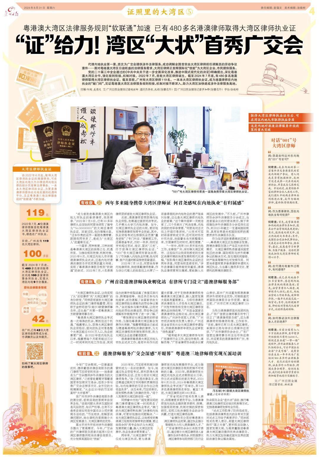 “一年中,我有190多天在内地工作,主要在广州、深圳等大湾区城市。这些经历让我深刻感受到大湾区法律环境的快速发展和现代化进程。”在取得大湾区律师执业证的这两年多里,何君尧明显感受到,“涉外法律事务越来越受到重视,港澳执业律师更有归属感,更能融入大湾区的发展中。”不久前,广州市律师协会涉外法律服务分会成立,当选首届会长的何君尧表示,接下来将推动涉外法律服务分会实体化运作,到2025年建立一支通晓国际规则、具有世界眼光和国际视野的高素质涉外法律服务队伍。