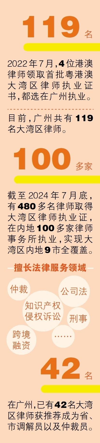 党的二十届三中全会通过的《中共中央关于进一步全面深化改革、推进中国式现代化的决定》明确提出,深化粤港澳大湾区合作,强化规则衔接、机制对接。2022年7月,首批大湾区律师诞生。截至2024年7月底,有480多名港澳律师取得大湾区律师执业证。截至目前,广州有大湾区律师119名。一本本大湾区律师执业证,成为港澳律师在内地执业的“敲门砖”,见证粤港澳大湾区法律服务规则衔接、机制对接不断深入,助力大湾区加快建成涉外法律服务高地。