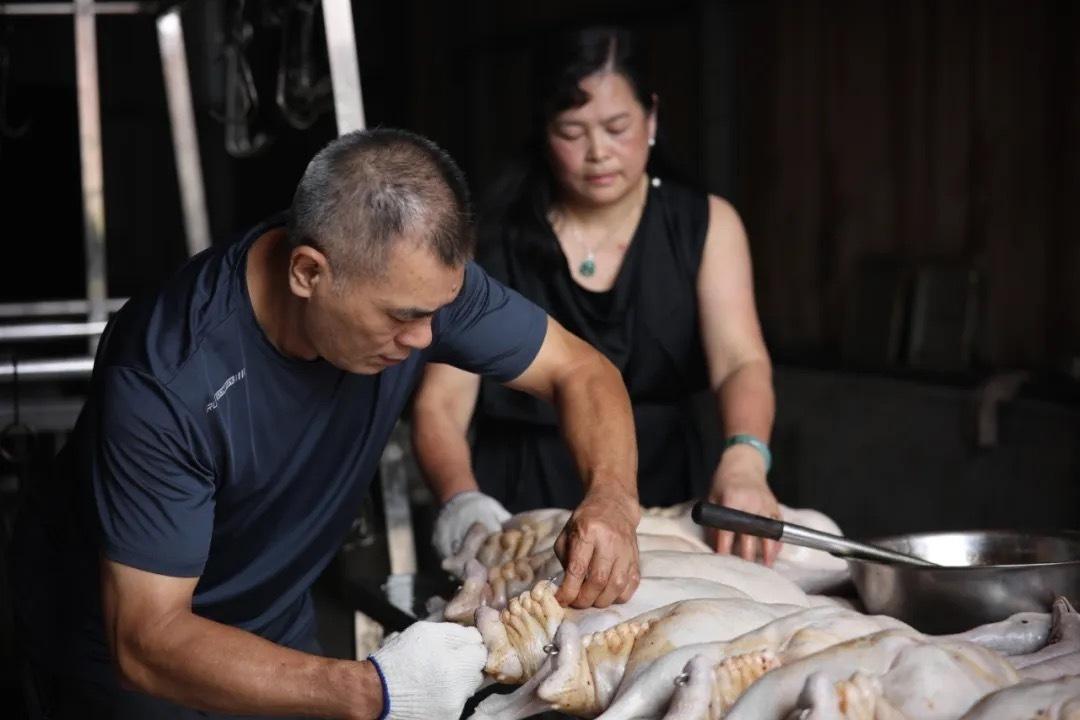 在永兴烧鹅店,叶永强和妻子何润梅已经经营了22年。店铺里挂着不少明星打卡的合影,它们不仅是时间的印记,更是这对夫妇相濡以沫、共同奋斗的见证。叶永强十几岁就跟着父母学做烧鹅,他对这门手艺有着深厚的感情。