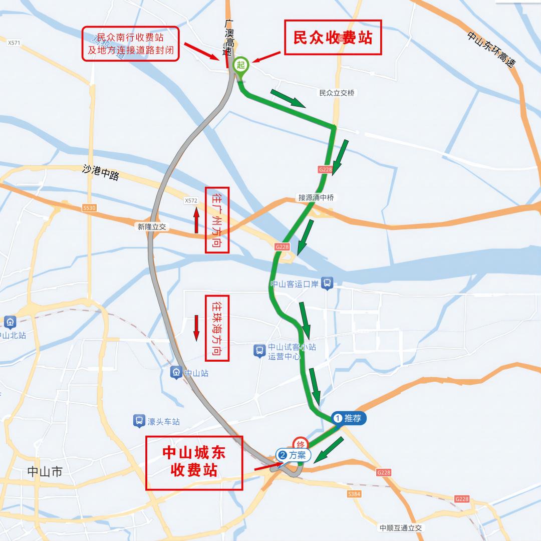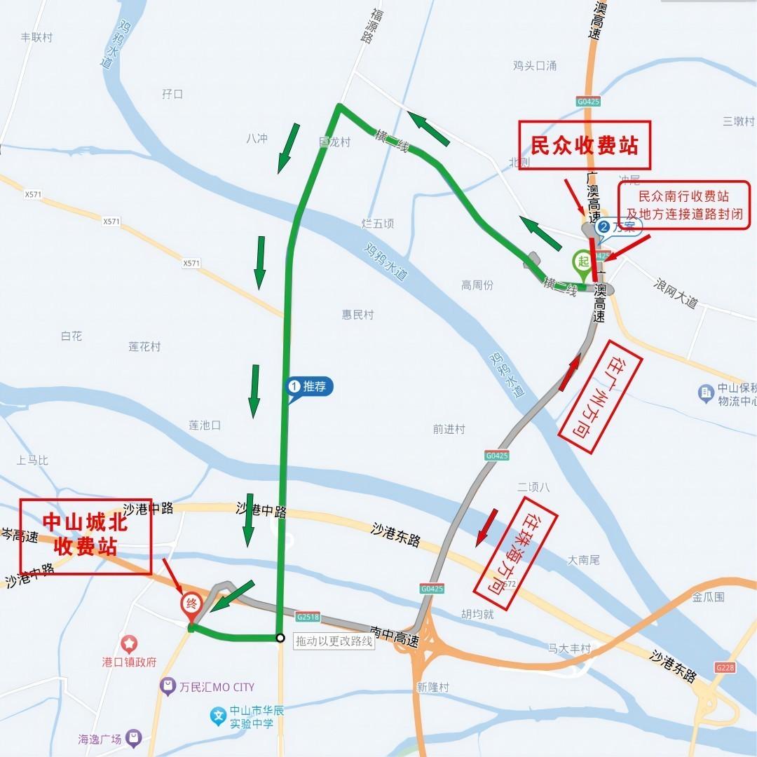 (二)需从民众收费站进入经中江高速往江门方向车辆绕行路线:横二线→福源路→三角快线→中山城北收费站。