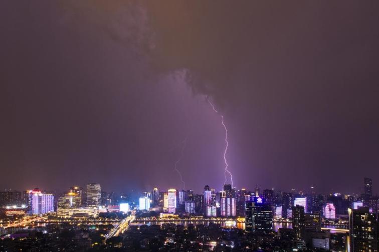 9月2日广州电闪雷鸣,并下起大雨。闪电频繁,一道道闪电划破广州城区夜空。