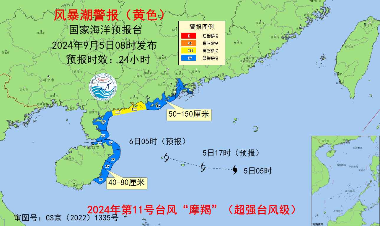 国家海洋预报台9月5日8时发布风暴潮黄色警报。受今年第11号台风“摩羯”(超强台风级)的影响,预计9月5日上午至6日上午,广东珠江口到雷州半岛东岸沿海将出现50到150厘米的风暴增水,海南岛东北部沿海将出现40到80厘米的风暴增水。