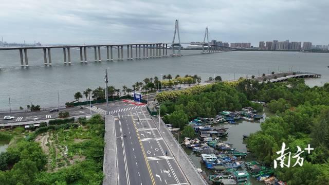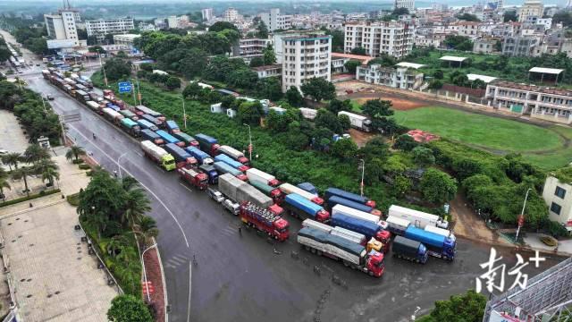 在台风来临前夕,不少过港往海南方向的货车在徐闻环半岛公路,徐海路(207国道海安段)和进港公路排起长队。