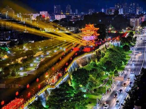 中秋假期,肇庆市端州区举办“一样的月光 不一样的端州”2024年端州月饼中秋灯会,吸引了数千名市民与游客前来观赏游玩。他们在千年宋城墙上提灯夜游,畅享端州府城之美,感受传统节日的浓厚氛围。