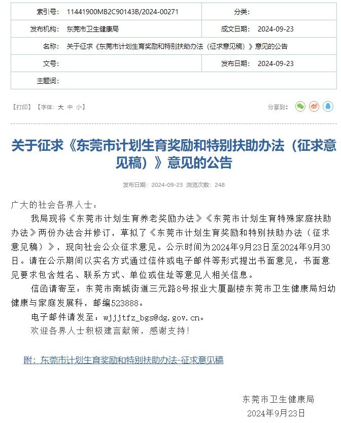 近日,东莞市卫生健康局发布关于征求《东莞市计划生育奖励和特别扶助办法(征求意见稿)》意见的公告,文件显示,符合条件的申领对象,计划生育奖励发放标准为每人每月330元,该办法正在公示期,拟于2025年1月1日起施行。