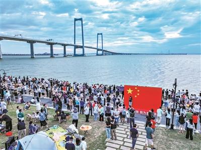 在深中通道中山入口处,游人相约马鞍岛打卡美景。
