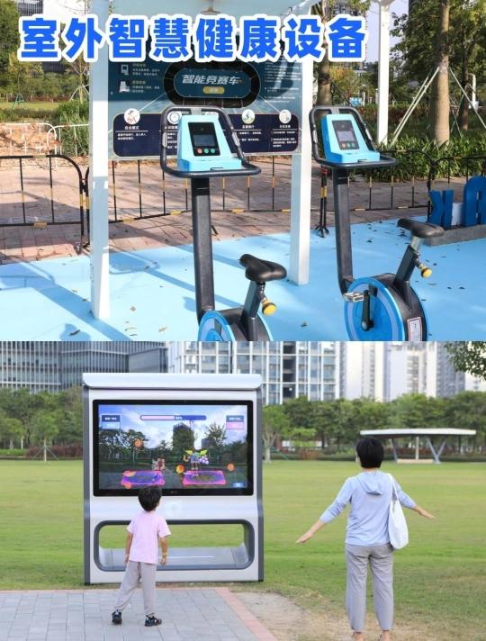 值得一提的是,金山体育公园是全市首个安装室外智慧健康设备的公园。智能竞赛车、体测中心、高拉推举双功能训练器……智能健身器材整齐排列,俨然一座搬到室外的健身房。不仅如此,每个智能健身器材上都装有一把景观化太阳能“大伞”,不仅能遮风挡雨,还能将储能用于健身器材各种功能的使用。在器械上扫码就可实时查看健身指导视频,以及运动时间、里程、频率、热量消耗、排名、运动历史等信息,一目了然。