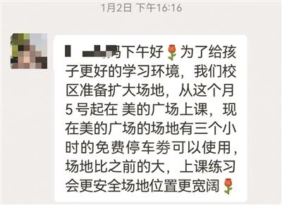 对于为何有家长报名一个月就被通知培训场地更换,是否涉及隐瞒,卫先生表示,“由于是加盟店,不清楚相关情况。”但他表示,“已经交费的家长可以继续到美的广场上课,但不支持退费。”记者继续追问原因,对方表示,“原大融城店负责人已经没有偿还能力。”