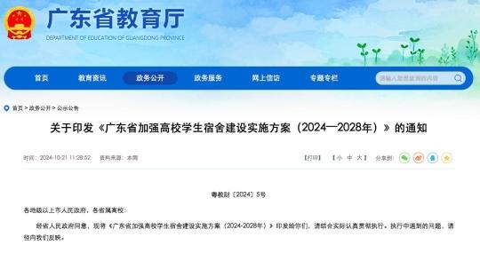 10月21日,广东省教育厅对外公布《广东省加强高校学生宿舍建设实施方案(2024—2028年)》(以下简称《方案》)。