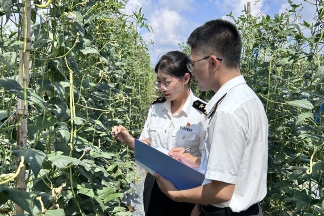 关员深入田间地头查看记录农产品生长情况。