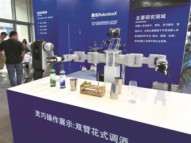 腾讯Robotics X实验室的高性能仿人五指灵巧手TRX-Hand5同样令人惊艳。据工作人员介绍,这只灵巧手不仅拥有13个自由度、20个活动关节,还配备了1163个触觉感知单元,其手指关节速度超过200度/秒,指尖力可达22N,能够提拉20kg的重物,并完成人手全部的33种抓取模式。在展会现场,它轻松地比出“耶”的手势向观众致意,令人捧腹。此外,该展位的双臂花式调酒机器人则通过抛接、搅动、倒酒等一系列复杂精巧的动作,高度集成性地展示了腾讯在机器人本体、感知与控制上的技术成果。