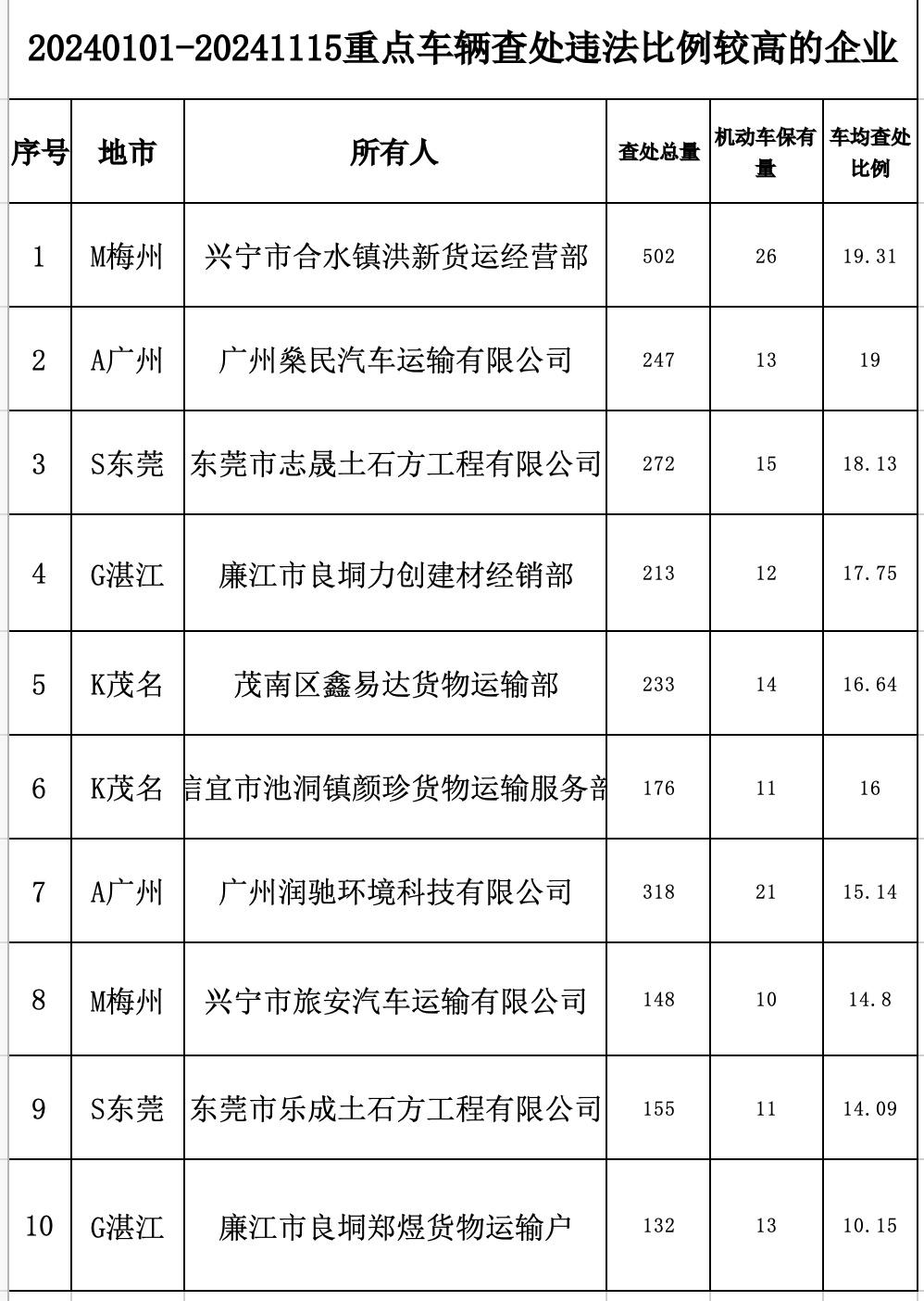 今年以来,高风险运输企业包括梅州兴宁市合水镇洪新货运经营部、广州燊民汽车运输有限公司、东莞市志晟土石方工程有限公司、湛江廉江市良垌力创建材经销部、茂名茂南区鑫易达货物运输部、茂名信宜市池洞镇颜珍货物运输服务部、广州润驰环境科技有限公司、梅州兴宁市旅安汽车运输有限公司、东莞市乐成土石方工程有限公司、湛江廉江市良垌郑煜货物运输户10家违法比例较高的企业,其中梅州兴宁市合水镇洪新货运经营部的机动车保有量为26台,截至11月15日被查处总量达502次,车均违法比例达19.31次,广州燊民汽车运输有限公司车均违法比例达19次。这些企业的主要违法行为包括驾驶机动车违反禁令标志指示、驾驶机动车超速行驶、乘坐人员未按规定使用安全带等行为。梅州兴宁市合水镇洪新货运经营部和广州燊民汽车运输有限公司两单位今年因车均违法比例较高,已被省道安办多次曝光。