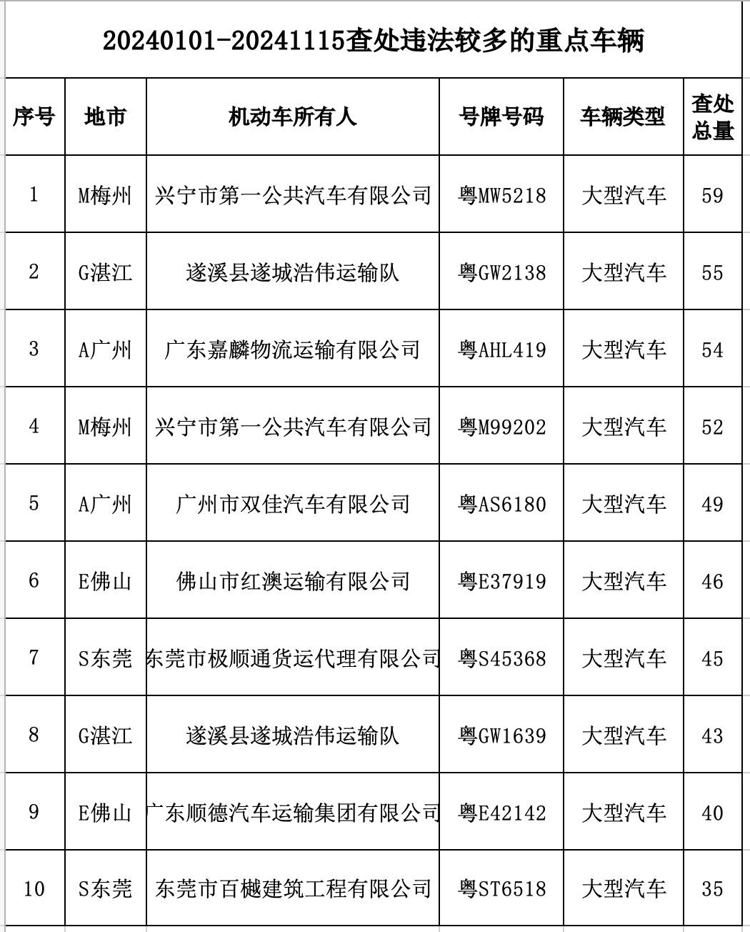 今年以来违法较多的重点车辆包括梅州兴宁市第一公共汽车有限公司的粤MW5218、湛江遂溪县遂城浩伟运输队的粤GW2138、广东嘉麟物流运输有限公司的粤AHL419、梅州兴宁市第一公共汽车有限公司的粤M99202、广州市双佳汽车有限公司的粤AS6180、佛山市红澳运输有限公司的 粤E37919、东莞市极顺通货运代理有限公司的粤S45368、湛江遂溪县遂城浩伟运输队的粤GW1639、广东顺德汽车运输集团有限公司的粤E42142、东莞市百樾建筑工程有限公司的粤ST6518共10辆车,梅州兴宁市第一公共汽车有限公司的粤MW5218违法次数最多,高达59次,湛江遂溪县遂城浩伟运输队的粤GW2138违法次数达55次。