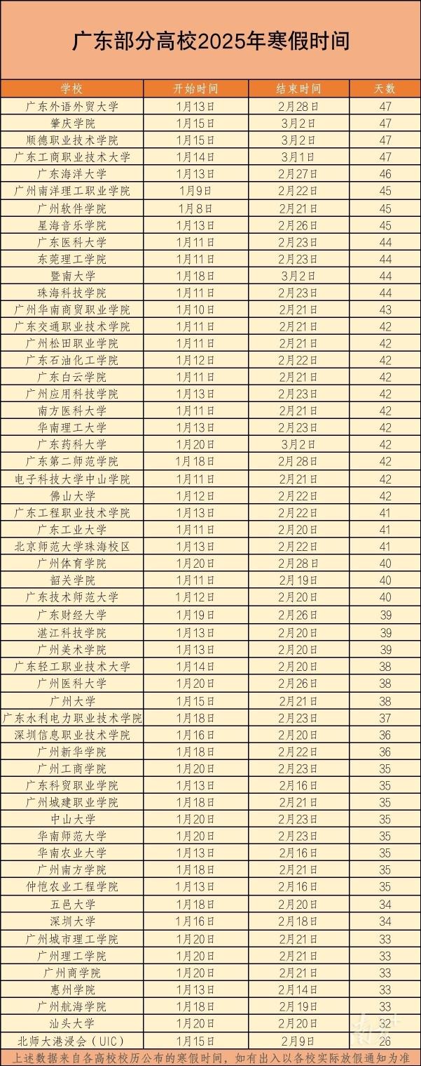 记者梳理广东56所高校公布的校历后发现,大部分学校均在1月中旬放寒假,2月下旬开学,放假时间最长的有47天,最短26天。