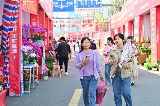潮流赋能、活力迸发。今年花市不仅有寓意吉祥的年花年桔,还汇聚了众多潮玩文创好物,更有肯德基、益力多、东鹏特饮等多个大品牌入驻,为传统花市增添了时尚与活力。值得一提的是,花市还专门设置了车展区,引进了一汽奥迪、极氪、小鹏、鸿蒙智行、问界、零跑等多个知名汽车销售品牌参与,进一步丰富花市购买体验。