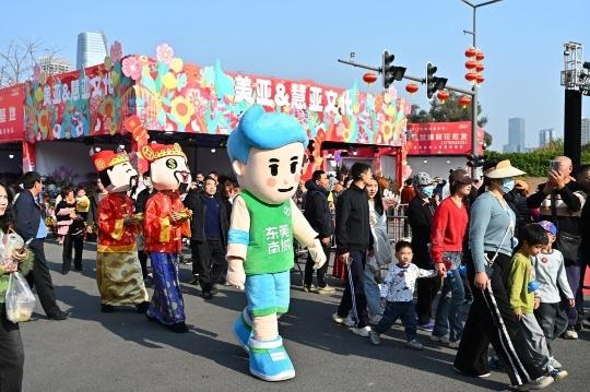 开幕式当天,“潮流东莞・火柴盒”音乐会专场为观众带来了别出心裁的音乐盛会,优美的旋律、动人的表演,让现场观众沉浸其中,掌声与欢呼声此起彼伏。而春之声新春文艺演出、追梦艺术团专场演出、金韵台专场演出等各类精彩演出和互动也将陆续上演。现场还安排了醒狮巡场、“潮流南城”帅帅IP玩偶随机快闪,与现场市民互动合影,让市民在逛花市的同时也能享受到一场场文娱盛宴。