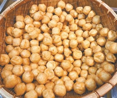 覃菊还告诉记者,信宜的豆炸要数双乐村的最为出名,不仅富含人体所需的多种营养物质,而且外韧里松,香气浓郁,具有独特的地方风味。双乐村的豆炸有球形状,也有条形状,当地村民称球形状的为“黄金果”,称条形状的为“黄金条”,寓意美好,因而豆炸成了大成镇各种喜宴不可缺少的菜肴。喜宴结束后,主人家通常会让宾客带两袋豆炸回去和家人品尝,分享喜悦。