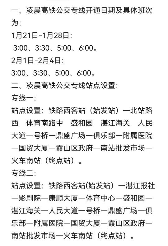 据悉,为便利粤西地区人民的出行“多元化”需求,湛江西站自1月20日—28日共开行夜间高铁14趟。同时,为更好衔接湛江西站高铁列车班次,湛江公交集团临时开通凌晨高铁公交专线。