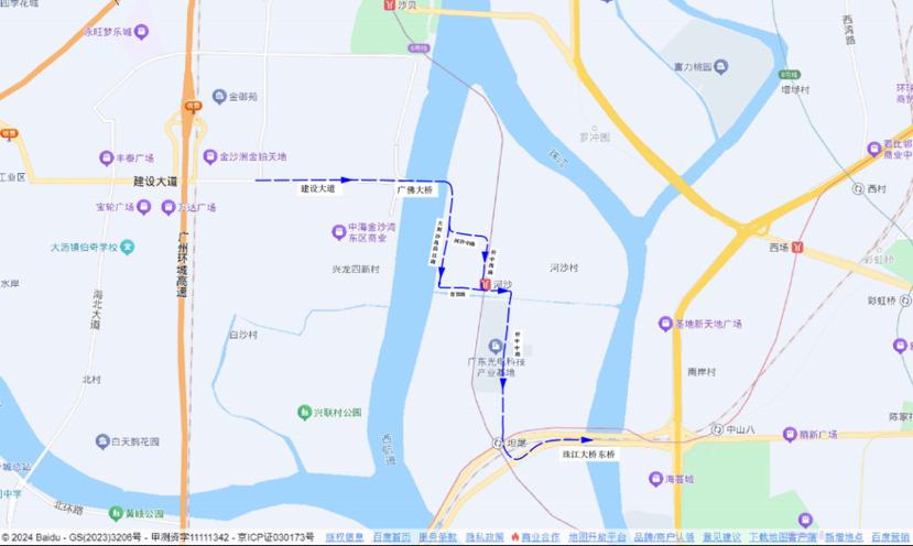 (一)佛山、金沙洲往广州市区方向:佛山建设大道→广佛大桥→大坦沙岛沿江路→河沙中路/育贤路→桥中中路→珠江大桥东桥。