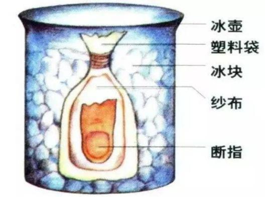 当发生手指离断时,第一步:用干净的纱布或毛巾包裹断指,放入干净不透气的塑料袋内密封保存。第二步:将塑料袋放入装有冰块的容器中,切记勿将断指直接接触冰块(图四)。一定要记住,不能用任何溶液(包括酒精、碘伏、盐水等)浸泡或接触断指,不然会影响断指再植成功率。