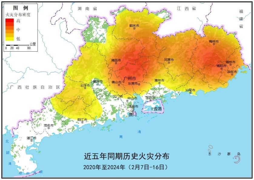 火源情况方面,历史同期火源中,本时段近二十年历史同期卫星热点数量同比减少了22%,韶关、河源、梅州、惠州、湛江、茂名、肇庆、清远等地卫星热点较多。本时段近20年卫星热点中,经核实反馈林火占比3%,农事用火占比48%,计划用火占比17%。本时段近五年历史同期火灾数量同比持平,主要发生在广州、韶关、河源、梅州、肇庆、潮州、云浮等地,起火原因主要是祭祀用火,此外还有农事用火、野外吸烟、电线短路、痴呆弄火、纵火、未成年人玩火等。