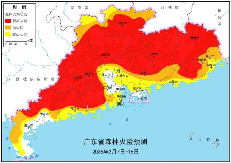 日前,广东省应急管理厅发布春节后期森林火险趋势分析报告(2025年2月7日-16日)(以下简称“报告”)。报告指出,综合考虑天气、林情、火源、社情和地势等因素,预计本周我省大部地区的森林火险等级为较高火险(三级);其中粤东大部、粤西中部、珠三角东部和西部的森林火险等级为高火险(四级);粤东西部、粤北大部、粤西北部、珠三角东北部和西部的森林火险等级为极高火险(五级)。