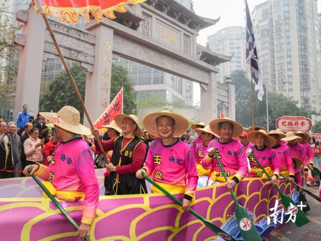 巡游队伍由十八大方阵组成,有英姿飒爽的少儿武术队、庄严威武的北帝銮驾护卫队,共有1100多人参加,其中中小学生340多人。