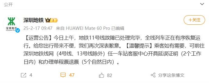17日9时47分,深圳地铁称地铁11号线故障已处理完毕,全线列车正在有序恢复运行。给乘客出行带来不便,我们再次深表歉意。并提示乘客如有需要,可前往深圳地铁线网(4号线、13号线除外)任一车站客服中心开具延误证明(2个工作日内)和办理单程票退票(5个自然日内)。