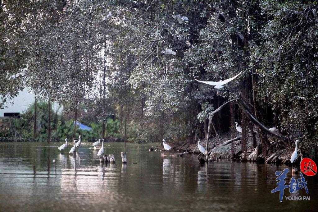 古劳大埠防汛楼前,一泓碧水环绕,孤然挺立着一棵古榕,葱茏繁茂。上千白鹭翔集其上,鸣声清越,打破水乡的静谧,也唤醒了沉睡的诗意。它们或振翅高飞,搏击长空,似与霞光共舞;或静栖枝头,宛如素雪凝枝,点缀着葱茏绿意;或轻点水面,捕食游鱼,泛起圈圈涟漪,恰似奏响自然的弦音。这灵动的鹭影,绘就一幅“水清河畅白鹭翔”的绮丽画卷,成为侨乡一道亮丽的风景线,也成就了这方“鹭鸟天堂”的美名。