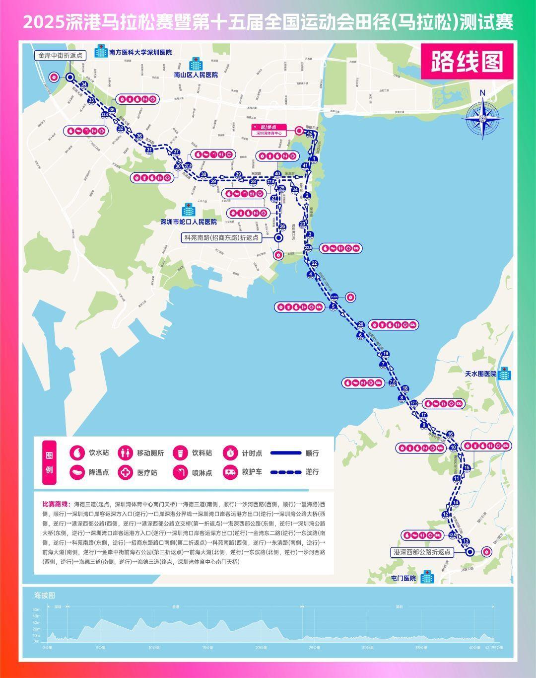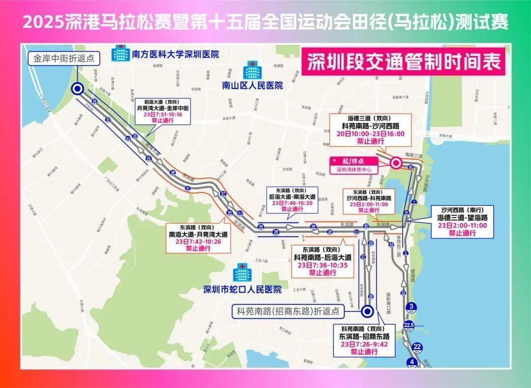 3.2025年2月23日2:00至11:00,对比赛线路涉及的临近道路进行交通管制,海德三道双向(科苑南路至沙河西路)、沙河西路南行(海德三道至望海路)、东滨路双向(沙河西路至月亮湾大道)、科苑南路双向(东滨路至招商东路)、前海大道双向(月亮湾大道至金岸中街)实行封闭管理措施,过往车辆需提前规划绕行路线。