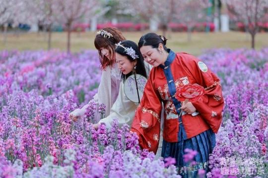 “一袭汉服赴春约,踏青赏花享春色。”活动当天,来自广州、佛山等地的近60名女性代表身穿汉服,穿梭于花海之间,打卡绿美踏青赏花线路,开启广东省森林文化周春季系列活动沉浸式体验。