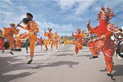 节目演毕,各支文娱表演队伍按照既定顺序和路线进行游演。县城的主干道上,早晨八九点就开始有人守候在十字路口,期望一睹游演风采。一般来说,在开阔的十字路口,游演队伍还会稍微露两手表演一番。当地人都会满怀期待地站在道路两侧驻足观赏,不会闯进路中阻碍巡游队伍行进。