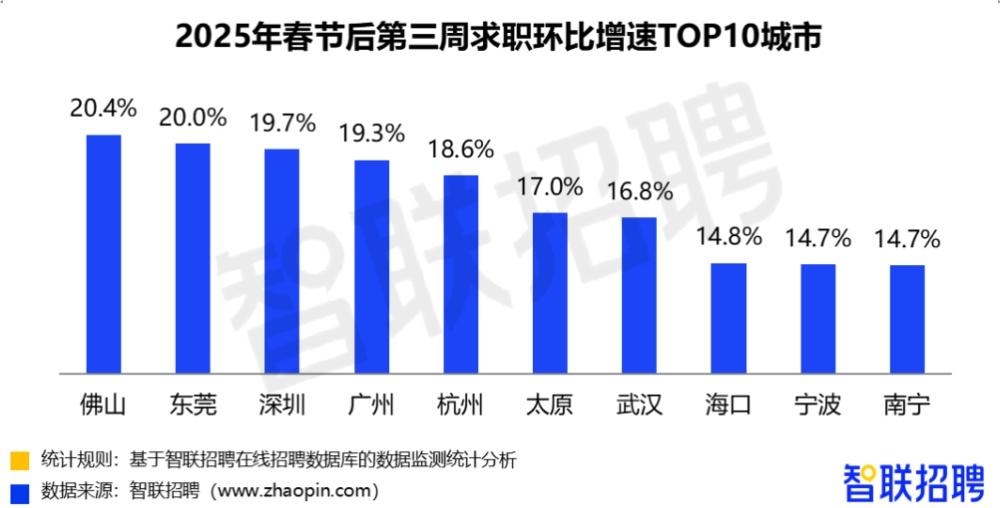 求职增速前十的城市还有深圳、广州、杭州、太原、武汉、海口、宁波、南宁,环比增速均在1-2成。其中,广州求职环比增长19.3%。