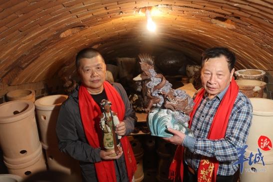 潘柏林(右)、封伟民(左)取出第一批开窑后第一批作品