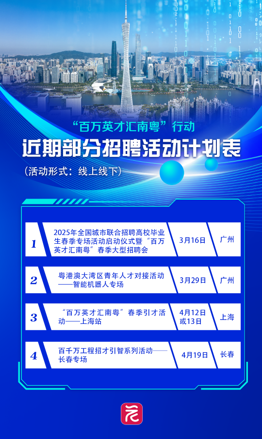 具体来说,共有三个方面的重点安排。首先,以省委、省政府名义开展“2+N”重点招聘活动。举办2场“万企万岗”大型综合招聘会,采取线上线下相结合的方式,分别于春、秋两季,在广州、深圳各举办1场大型综合招聘会,组织驻粤央企、省市国企和上万家重点企业,提供数万个有竞争力的优质岗位开展招聘。举办N城联动招聘活动,分别于春、秋两季,以广东专场形式,在北京、上海等多个城市开展招聘活动,省领导同志带队,省市组织企业、学校、医院、科研院所等用人单位参加,拿出有竞争力的薪酬岗位,主动上门邀约优秀高校毕业生。