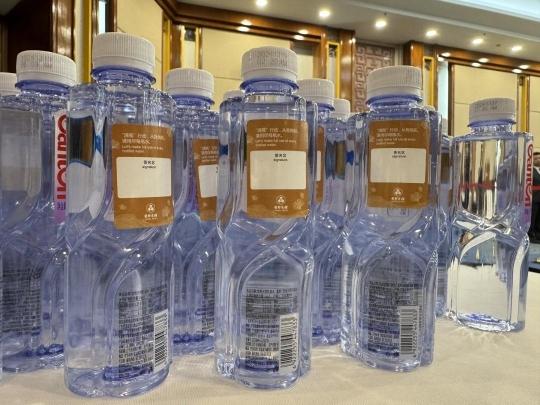 矿泉水瓶上还贴了一行中英文温馨提示——“清瓶”行动,从我做起,请用尽每瓶水。
