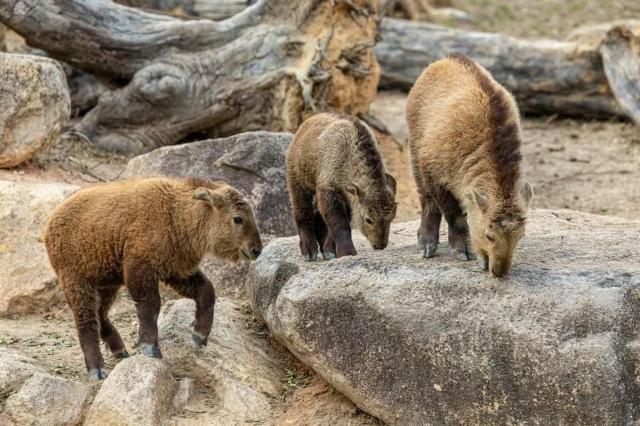 长隆森林王国保育专家严玉标介绍,这三头金毛羚牛分别于2024年12月15日、2024年12月16日、2025年1月27日出生。虽然三个“小家伙”才满月不久,体重不到成年金毛羚牛的十分之一,但它们却走出了“初生牛犊”的气势。