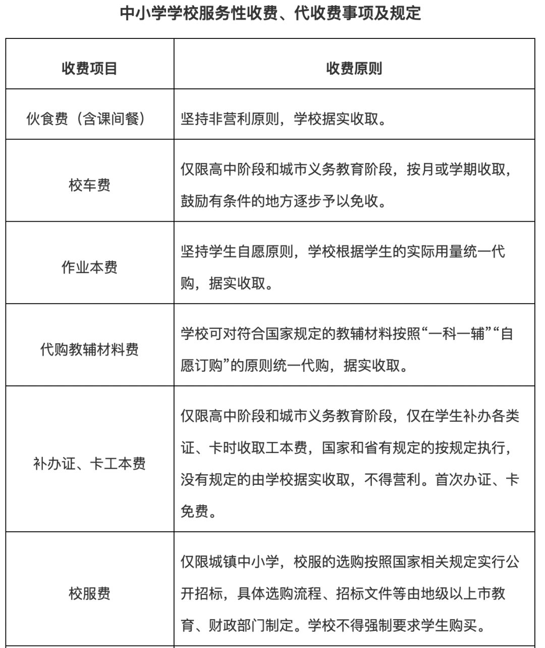 在规范服务性收费和代收费管理方面,《通知》提出,各地不得将教育教学活动、教学管理范畴内应免费提供服务的项目、国家和省已明令禁止或明确规定纳入公用经费开支的项目列为服务性收费和代收费,严禁越权设立收费项目和违反规定提高收费标准。