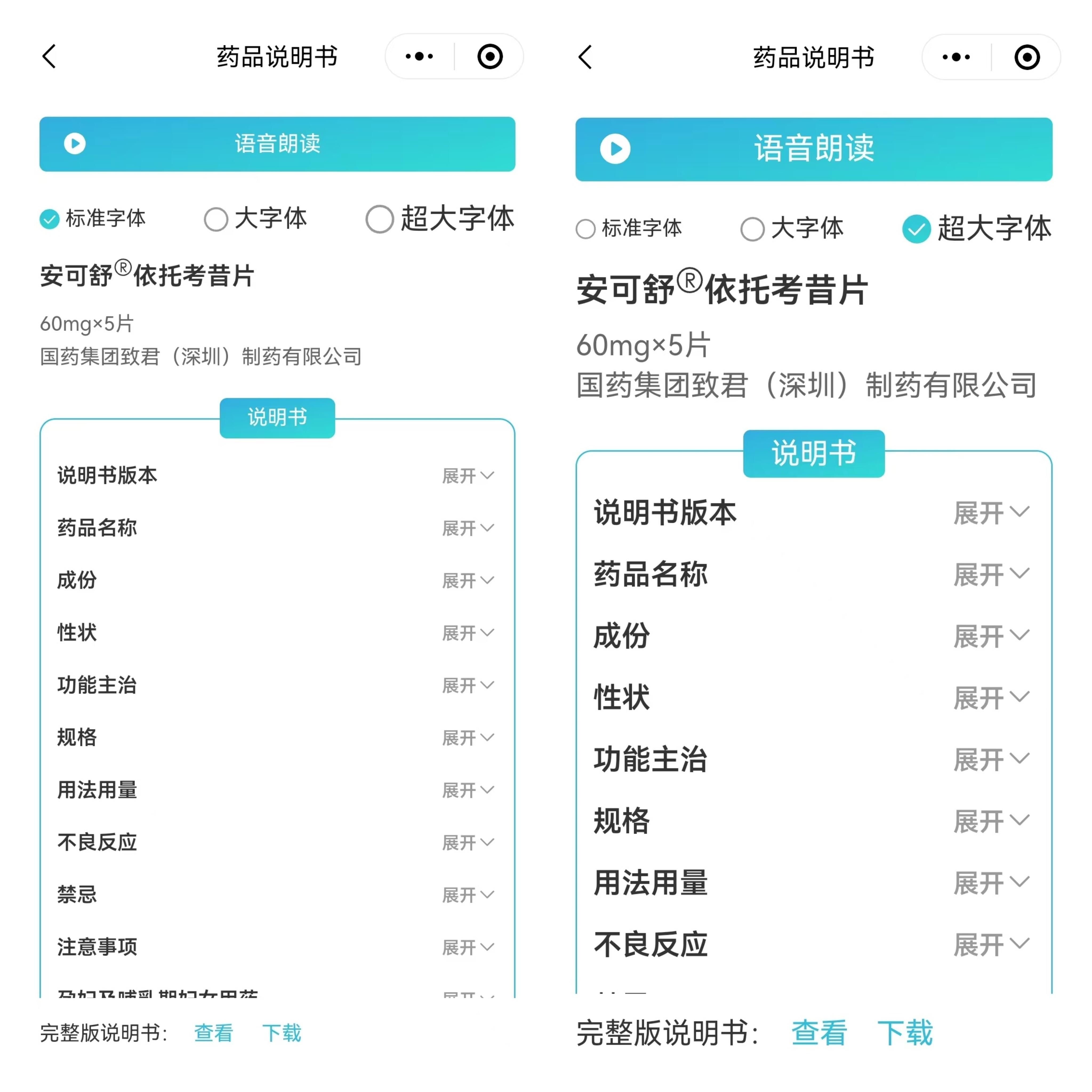 依托考昔片电子药品说明书可选择字体大小、语音朗读等