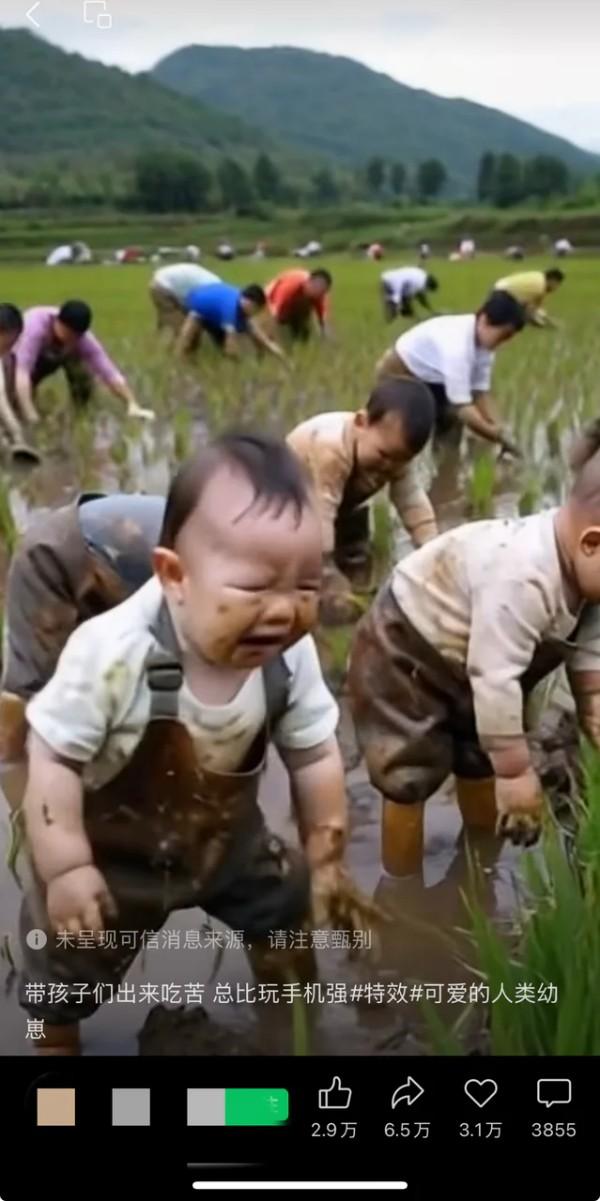 以情动之。两岁左右的“懂事小孩”跟着大人们下田插秧,“赛博乖孙”奶声奶气叫“奶奶”……这类视频抓住了老年人的情感需求,成为一种专供老年人的新型文娱产品,真假不重要,重要的是“萌”“温情”。2025年《国民视觉健康报告》显示,60岁以上老年人日均手机使用时长达4.2小时,较五年前增长300%。AI视频产品满足了他们对可爱小孩、实用宠物、温情故事的需求,在子女陪伴较少的时候,成为一种情感寄托。