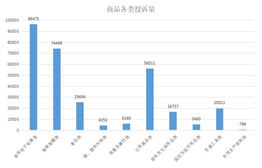 商品类投诉中,家用电子电器(96475件)、服装鞋帽(74449件)和日用商品(56011件)居投诉量前三位。家用电子电器投诉量最大,占比13.34%,集中在移动电话、家用小电器和便携式计算机。服装鞋帽投诉增量最大,比去年增加30189件,同比上升68.21%。