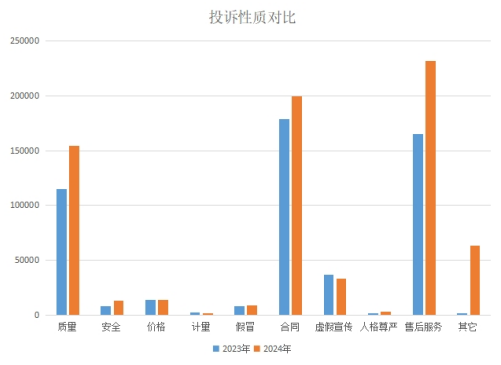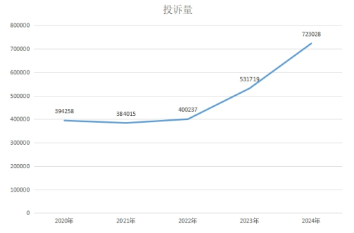 根据投诉类别分析,2024年,服务类、商品类投诉量均上涨。其中,商品类投诉306049件,同比增长27.41%,占投诉总量42.33%;服务类投诉351525件,同比增长22.57%,占投诉总量48.62%。