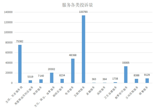 服务类投诉中,互联网服务(133793件)、生活社会服务(75382件)和电信服务(48368件)居投诉量前三位。互联网服务类投诉总量仍然高企,电信服务类投诉增量最大,同比增加22388件,增幅达86.17%。而教育培训服务、金融服务和卫生保健服务三类服务投诉有所下降。