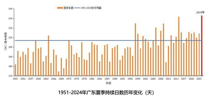 2024年广东平均夏季日数达233天,较常年偏多28.6天,为有气象记录以来广东最长夏季,其中广州、惠州、揭阳等12个地市的夏季日数破历史纪录。