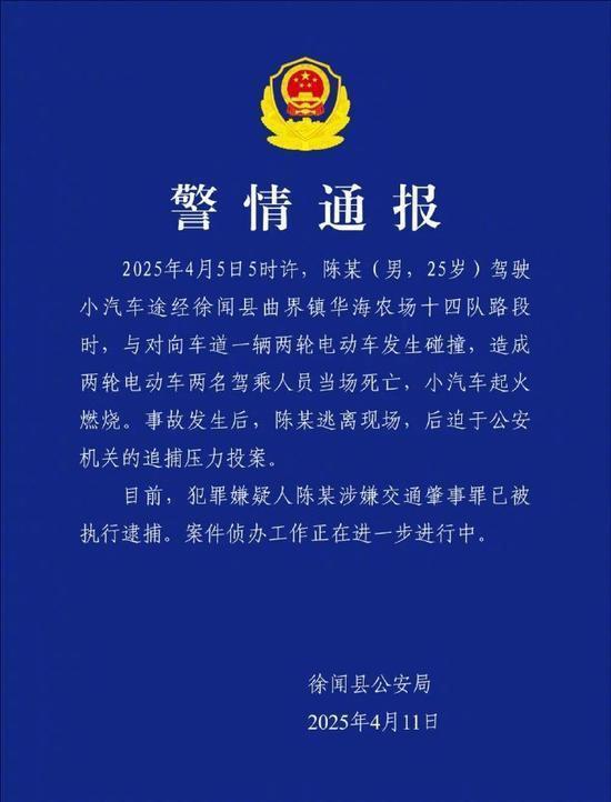 4月11日,广东湛江徐闻县公安局通报:2025年4月5日5时许,陈某(男,25岁)驾驶小汽车途经徐闻县曲界镇华海农场十四队路段时,与对向车道一辆两轮电动车发生碰撞,造成两轮电动车两名驾乘人员当场死亡,小汽车起火燃烧。事故发生后,陈某逃离现场,后迫于公安机关的追捕压力投案。