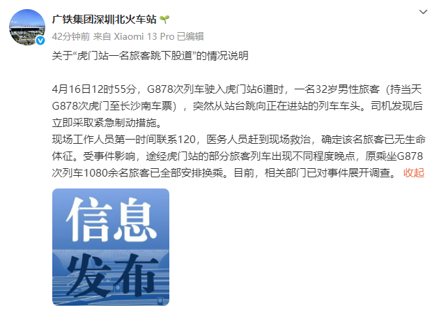 4月16日,广铁集团深圳北火车站发布关于“虎门站一名旅客跳下股道”的情况说明: