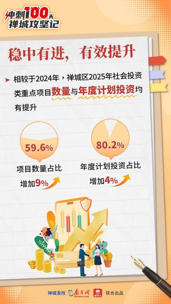 从纵向上看,有效投资对稳增长的关键作用持续发挥。相较于2024年,今年禅城区社会投资类重点项目数量与年度计划投资均有提升,项目数量占比59.6%,增加9%,年度计划投资占比80.2%,增加4%,在做优增量和盘活存量中全面提高资源配置效率。