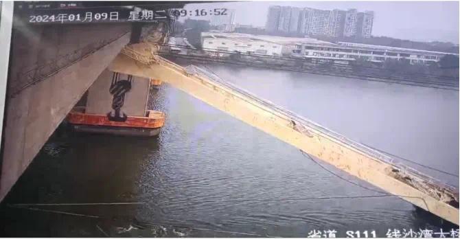 2024年1月9日9时16分,拖轮“海*7”船拖带起重船“建*4”船从广州番禺驶往江门新会途中,因拖带船组未谨慎选择更安全的航路,船员不掌握拖带船组水线以上最大高度,导致在航行至沙湾水道S111省道番禺沙湾大桥时,未保留足够的净空高度,“建*4”船船首吊臂触碰沙湾大桥B桥主通航孔挂梁。事故造成沙湾大桥B桥局部剐蹭破损露筋,混凝土开裂,沙湾大桥A桥局部受剐蹭破损;“建*4”船船首吊臂顶端右侧滑轮连同基座与吊臂脱离,两侧护栏不同程度受损。
