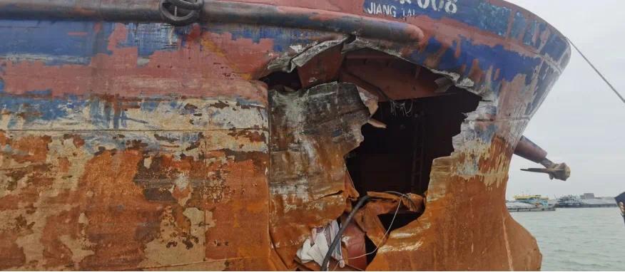 2025年2月21日23时32分,“江*8”船从肇庆四会驶往广州南沙,在航经顺德水道龙江大桥水域时,因值班二副饮酒后在驾驶台值班,判断能力和船舶操纵能力下降,且该船夜间未安排人员协助瞭望,导致船舶偏航触碰龙江二桥桥墩承台,造成“江*8”船首右舷船壳外板穿孔,内部相关结构变形、撕裂、局部破损,龙江二桥主墩承台转角外层水泥脱落。